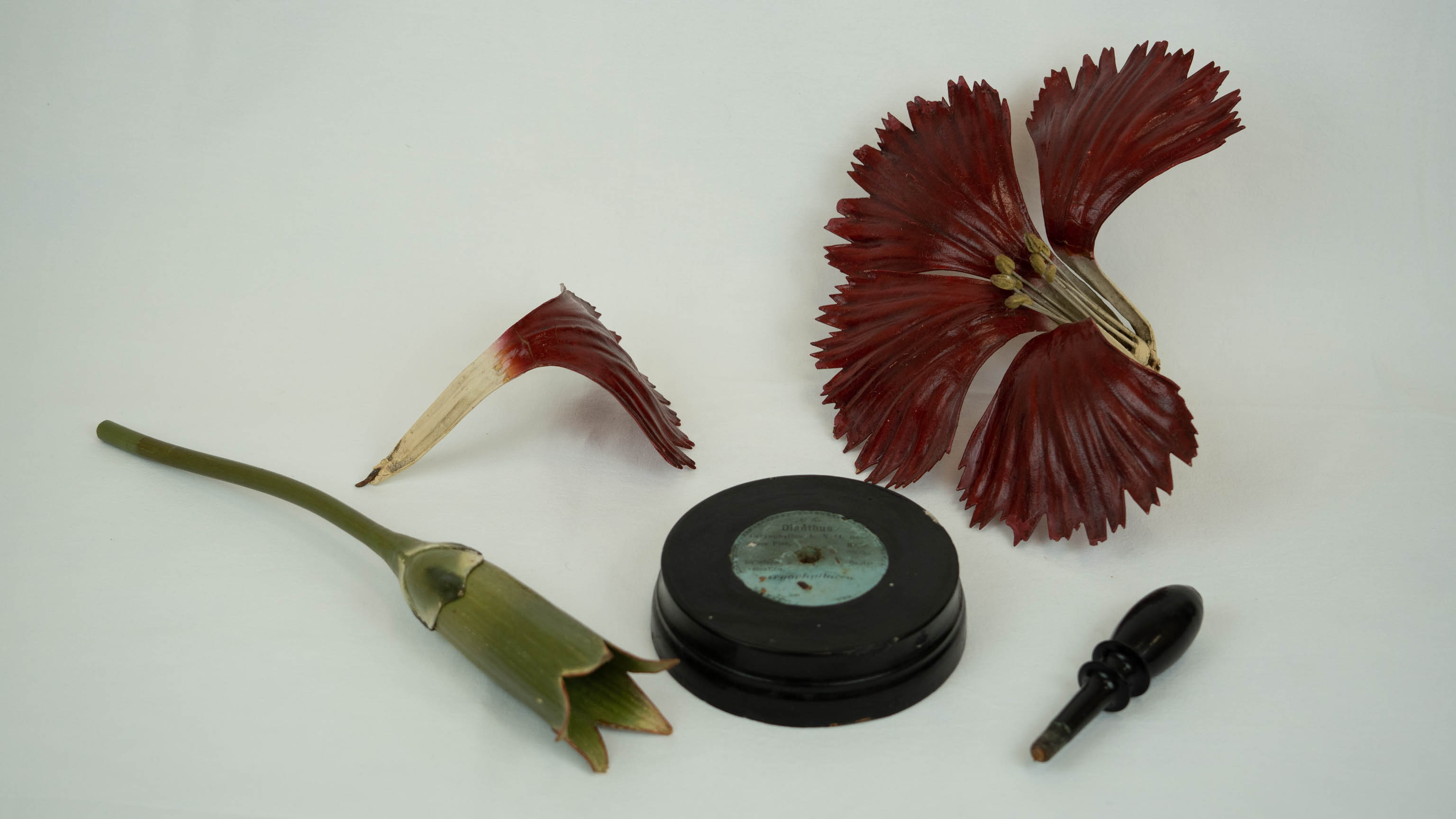 il modello didattico raffigura una riproduzione fedele e ingrandita di garofano, dal latino dianthus, della famiglia delle cryophyllaceae, come indicato sull'etichetta che si trova apposta sulla base di legno. Il modello, realizzato in cartapesta e dipinto con tempere, è scomponibile in più parti e permette di studiare il fiore in tutte le sue sezioni