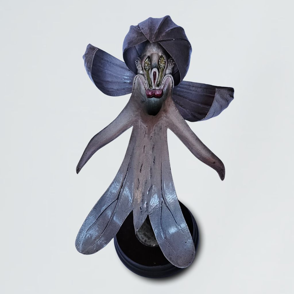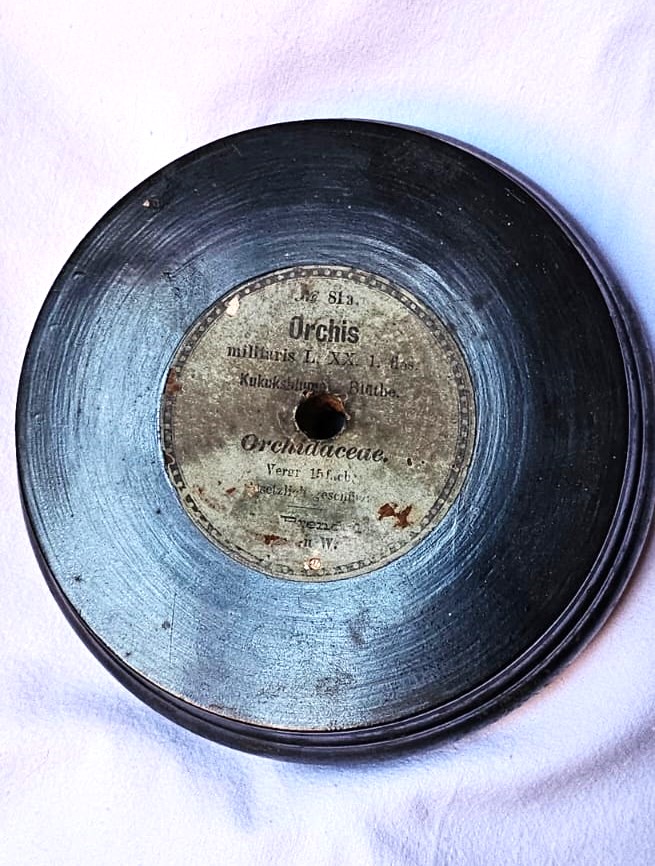 Il modello didattico raffigura una riproduzione fedele e ingrandita dell’orchidea militare (Orchis militaris L.), appartenente alla famiglia delle Orchidaceae. Realizzato in cartapesta e dipinto a mano, il modello rappresenta il fiore della specie, facilmente riconoscibile per la sua fitta infiorescenza a spighe e per la caratteristica forma del fiore che ricorda un elmo, da cui deriva l’epiteto militaris. Il fiore, di colore viola pallido, è accuratamente riprodotto. Il modello è montato su una base circolare in legno, e le sue parti sono scomponibili per consentire l’osservazione dei dettagli morfologici