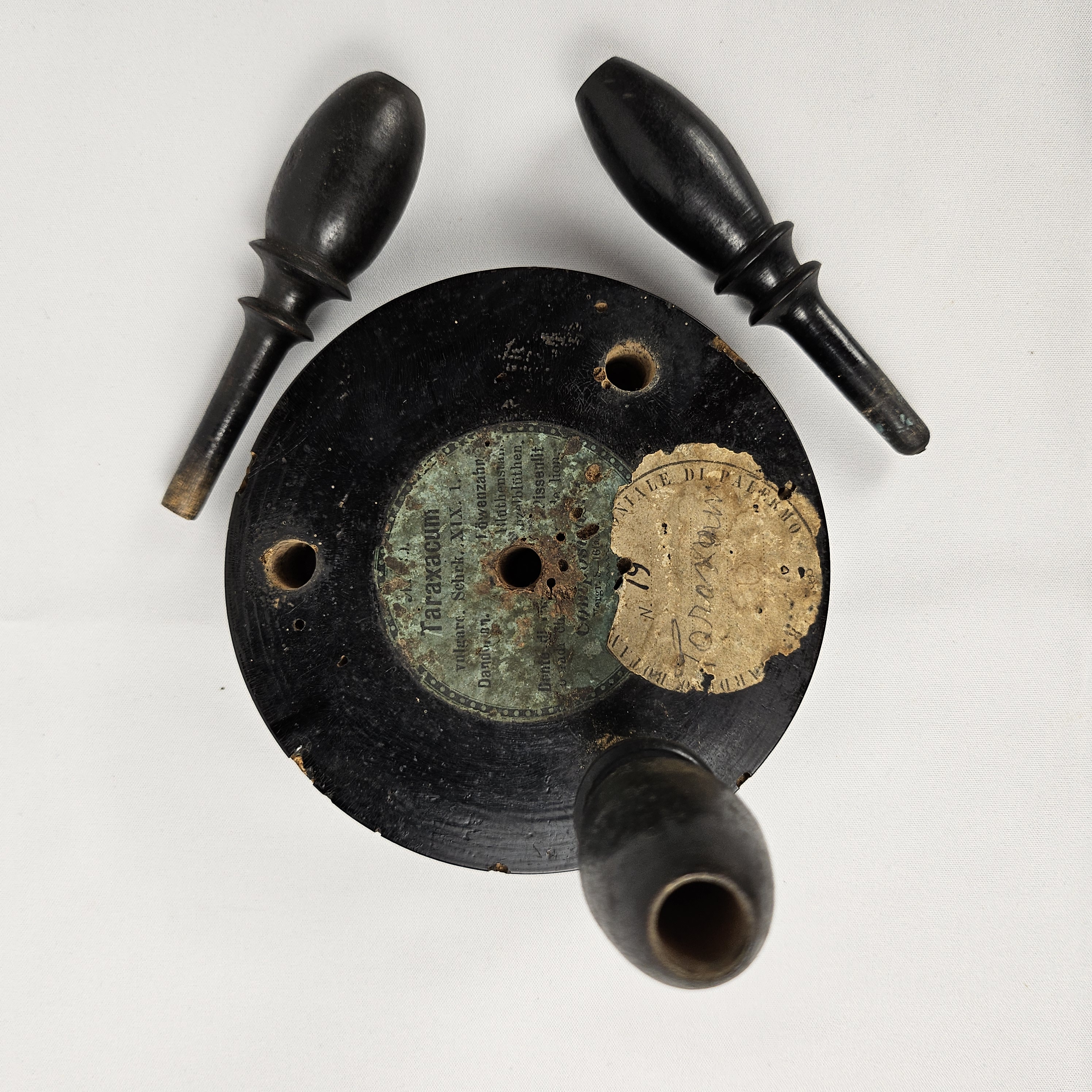 Il modello didattico, realizzato in cartapesta e dipinto a mano, raffigura una riproduzione fedele e ingrandita di Taraxacum vulgare, comunemente noto come dente di leone o dente di cane. Si tratta di una pianta erbacea perenne a fiore, appartenente alla famiglia delle Asteraceae (indicata sull’etichetta con il nome tradizionale di Compositae). Il modello del fiore poggia su una base tornita ebanizzata, alla quale è applicata un’etichetta verde. La base presenta quattro fori, ma sono presenti solo tre montanti, destinati ad accogliere i modelli delle principali parti fiorali: il capolino, il fiore ligulato e il frutto (achenio), che nel loro insieme rappresentano la struttura caratteristica della pianta
