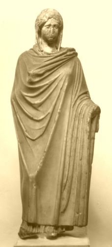 - NOTIZIE STORICO CRITICHE La testa è un calco in gesso di una replica delle stesse dimensioni, conservata all'Antiquarium del Celio a Roma. La statuetta veneziana, pur essendo unesecuzione modesta, riproduce il soggetto puntualmente, sia nellarticolarsi delle pieghe del panneggio, sia nella struttura compositiva, in cui sembrano incontrarsi, da un lato, la spiritualità, il sintetismo, la morbidezza attica, dall'altro il rigorismo e il tettonicismo dorico. Tale contrasto, fra intima esuberanza e rigore formale, fra lieve sensualità attica e severità dorica, rappresenta uninconfondibile caratteristica dello stile di Calamide, qui riproposto in una copia romana di piccole dimensioni, di età probabilmente antoniniana.
