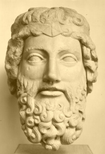 Testa maschile, circoscritta da un cercine, è caratterizzata dalla capigliatura che scende a ciocche spiraliformi ai lati del capo, dalla lunga barba a ciuffi ondulati con punte ricurve, dai baffi spessi e spioventi.