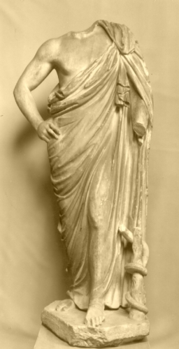 Figura maschile, con lieve torsione del corpo; veste un mantello, che scopre la spalla destra, dal panneggio caratterizzato da fitte pieghe a linee trasversali spezzate.