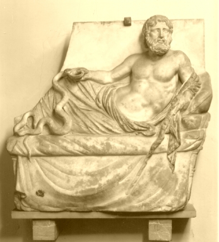 Defunto eroizzato disteso su letto, vestito del mantello che gli copre la parte inferiore del corpo, mentre il serpente si abbevera dalla patera che egli tiene nella mano d.; con la s. stringe un bastone ondulato.