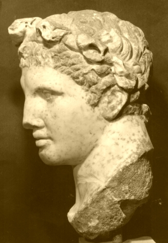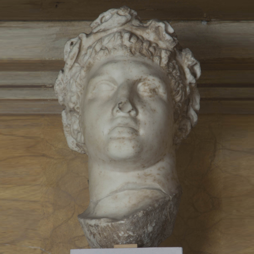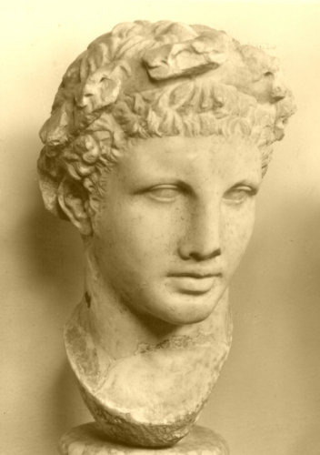 La testa ritrae un giovane dal volto dall'ovale pieno, caratterizzato da grandi occhi, naso diritto e labbra carnose appena socchiuse. L'acconciatura è costituita da capelli tagliati corti sul capo. In testa porta una corona di foglie.