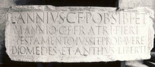 - ISCRIZIONI fronte - L(ucius) Annius C(ai) f(ilius) Pob(lilia) sibi et / M(arco) Annio C(ai) f(ilio) fratri fieri / testamento iussit. Probavere / Diomedes et Anthus liberti. - Lettere posate maiuscole - Incisione - latino