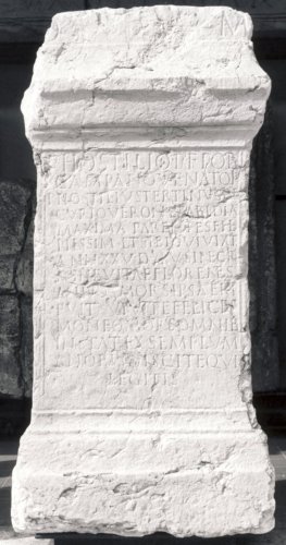 - ISCRIZIONI fronte - D(is) M(anibus). // P(ublio) Hostilio P(ubli) f(ilio) Pob(lilia) / Campano venatori, / P(ublius) Hostilius Tertius de/ curio Veron(ae) et Abidia / Maxima parentes fil(io) / piissim(o) et sibi qui vix(i)t / ann(os) XXV, d(ies) XXV, sine cri/ mine vitae florentes / annos mors ipsa eri/ puit vivite felices / moneo mors omnib(us) instat exemplum / a nobis discite qui / legitis. - Lettere posate maiuscole - Incisione - latino