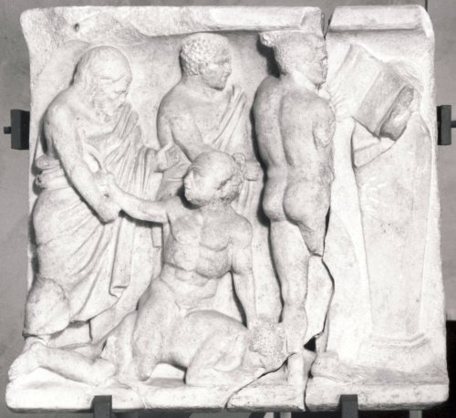 La porzione di sarcofago presenta margini superiore e inferiore costituiti da listelli. E' rappresentato a sinistra un gruppo di persone disposte ad anello: al centro un personaggio nudo siede sul dorso di un altro premendogli la faccia a terra con la mano sinistra, mentre l'altra, che tiene un piccolo ramo di palma, simbolo di vittoria, viene sollevata verso l'alto da un altro personaggio barbuto e con ampio mantello che lascia scoperta la spalla, disposto sulla sinistra. Dietro altro uomo con mantello. A destra personaggio nudo stante eretto e voltato nell'atto di leggere un volume appogiato ad un'erma (il completamento che lo mostra è moderno).