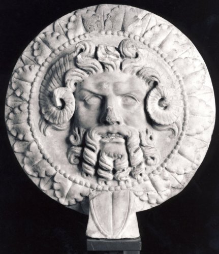 - NOTIZIE STORICO CRITICHE Alcuni studiosi (Modonesi, Beschi) lo indicano proveniente dal Teatro Romano di Verona, ma questa provenienza non è dimostrata. Teatini (2002) basa il suo contributo su questa ipotesi che tuttavia non è dimostrata Il culto di Giove Ammone è un culto proveniente dall'Egitto, ed entra nel mondo romano per mezzo dell'influenza greca; esso è molto attestato in particolare in età imperiale perchè legato al culto imperiale ed inoltre come protettore dell'esercito romano. De Toni (1907) riporta che nel 1571 Aldrovandi vede nella collezione Serego "Caput Iovis Amonis cum cornibus", che non è la chiave di volta dell'arco di Giove Ammone ma l'oscillum esposto ora al Maffeiano. All'interno della collezione Serego vi erano esemplari sia provenienti da Verona sia da Roma.