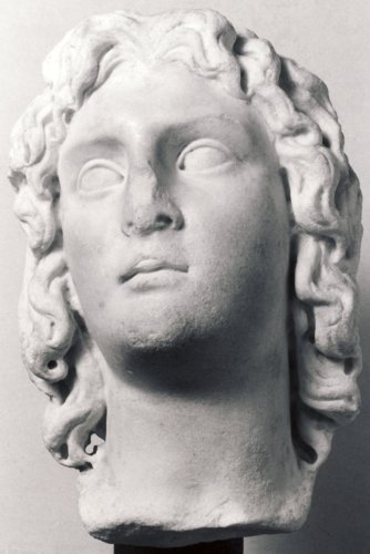 Testa di giovane uomo imberbe e con lunghi capelli mossi. La posizione è leggermente reclinata e volta a guardare verso l'alto. Il viso è caratterizzato da grandi occhi e guance piene.
