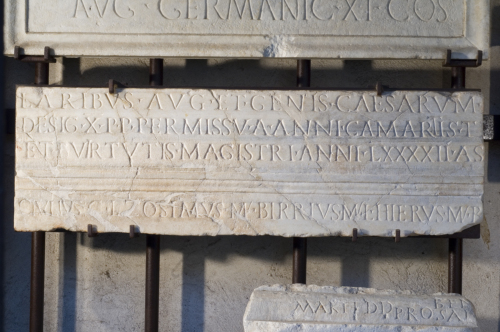 - ISCRIZIONI fronte - daribus Aug(ustis) et Genis Caesarum [Imp(eratore) Caes(are) Domitiano Aug(usto) co(n)s(ule) VIIII] / desig(nato) X p(atre) p(atriae) permissu A(uli) - Lettere posate maiuscole - Incisione - latino