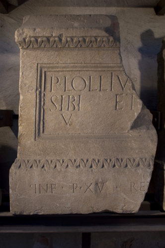 - ISCRIZIONI fronte - P(ublius) Lolliu(s) / sibi et [ - - - ] / v(ivus) [f(ecit)] / inf(ronte) p(edes) XV ret[ro- - - ]. - Lettere posate maiuscole - Incisione - latino