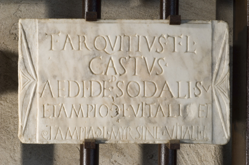 - ISCRIZIONI fronte - T(itus) Arquitius, T(iti) l(ibertus), / Castus / aedi(culam) ded(it) sodali su(o), / L(ucio) Tampio,(mulieris) l(iberto), Vitali [[A]] et / Tampia, (mulieris) l(iberta), Myrsine, Vitali, l(iberta). - Lettere posate maiuscole - Incisione - latino