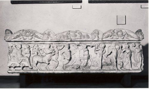 Sarcofago romano a cassa parallelepipeda, con coperchio, con un rilievo che corre su tre lati e che rappresenta un corteo. La scena inizia sul lato corto a sinistra del sarcofago e rappresenta un tronco di vite con grappoli, una menade e un satiro danzanti. Sul lato maggiore, da sinistra verso destra, sono rappresentati una figura maschile e una femminile su un carro, tirato da due centauri, uno vecchio e uno giovane, che tengono un flauto e una lira. Sul dorso del centauro vecchio si trova un amorino. Segue una divinità nuda, caprina, con la mano sinistra sul fianco e con il piede destro che percuote un cesto, dal quale esce una serpe. Subito a fianco del dio, sono rappresentati un satiro giovane, nudo, con un vaso, che danza torcendosi, due menadi, una in panneggio spesso e svolazzante, che regge in mano una doppia tibia, l'altra in torsione di danza, che mostra il lato posteriore del corpo, che regge una lira fra le mani. Sul fondo, dopo la menade con la lira, segue una colonna con capitello, poi un satiro giovane e nudo, con un otre sulla spalla sinistra, una pantera, un altro satiro nudo e una menade nuda con timpano. Sul lato minore a destra del sarcofago, sono rappresentati degli alberi sullo sfondo e due amorini, uno dei quali cavalca una pantera, che giocano con l'animale, e due donne, di cui una con un cesto e una con un vaso. Lo spessore del coperchio è ornato da altri rilievi: nell'arco al centro sono rappresentate due pantere ai lati di un cantaro; ai lati delle pantere si trovano due aquile, e negli archi più esterni coppie di amorini che portano una corona con nastri. Sugli spigoli del coperchio sono raffigurate teste umane. Sui lati corti dello spessore del coperchio si trovano due delfini affrontati.