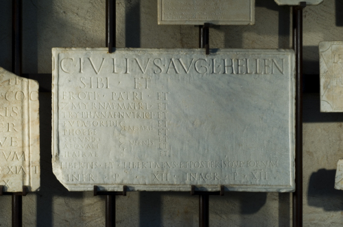 - ISCRIZIONI fronte - C(aius) Iulius, Aug(usti) l(ibertus), Hellen(us) / sibi et / Eroti, patri et / Zmyrnae, matri et / Tryphaenae, nutrici et / Phoebe et / Eupatoridi et // Caesaris // Secundo et / Aequali et // vernis // Ilairae et / libertis et libertabus et posterisque eorum. / In fr(onte) p(edes) XII, in agr(o) p(edes)XII. - Lettere posate maiuscole - Incisione - latino
