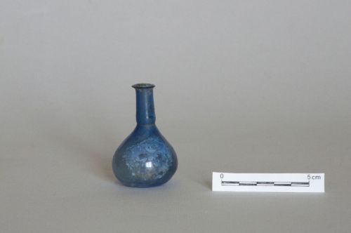 orlo estroflesso leggermente ingrossato, collo cilindrico sottolineato da una strozzatura alla base, ventre piriforme, base piana; vetro blu