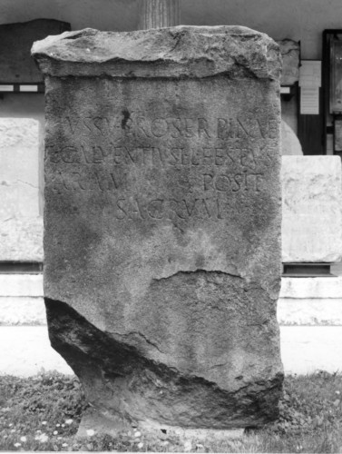 - ISCRIZIONI fronte - Iussu Proserpinae / L(ucius) Calventius L(uci) l(ibertus) / aram posit / sacrum - Lettere posate maiuscole - Incisione - latino