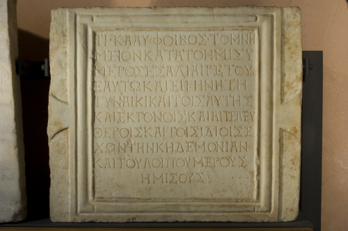 - NOTIZIE STORICO CRITICHE Le lettere dell'iscrizione sono alquanto curate, di grandezza e allineamento più regolari all'inizio del testo, meno alla fine; le apicature sono piuttosto accentuate. Nelle prima riga gli elementi onomastici del defunto sono separati da segnetti triangolari. Tra i caratteri epigrafici si può notare l'uso di un trattino orizzontale sopra l'alpha e il lambda e la terminazione della curva del rho in un ricciolo, tipica dell'età antoniniana. Il testo ricorda la condizione giuridica del sepolcro, una metà del quale è indivisibile e spetta alla famiglia del defunto, mentre egli si riserva la "kedemonia", cioè la curatela, dell'altra metà, forse destinata ad un altro ramo della famiglia o alienata. L'insistenza sui particolari giuridici riguardanti il possesso legale della tomba è una caratteristica che secondo T. Ritti riporta questa epigrafe all'area microasiatica.