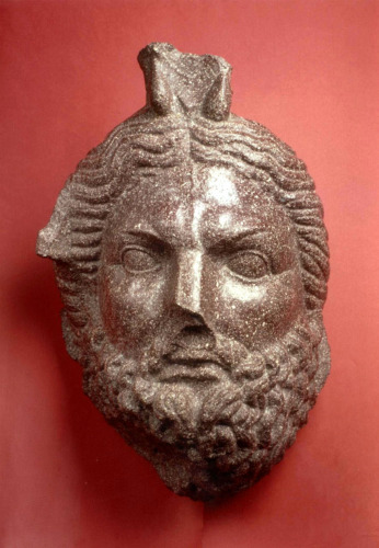 - NOTIZIE STORICO CRITICHE Il mascherone apparteneva a uno dei grandi bacini (labra) porfiretici che facevano parte dell'arredo delle terme di Caracalla. Essa ornava la parte inferiore di un'ansa appartenente a una vasca circolare di grandi dimensioni molto simile a un bacino parte della collezione Farnese, oggi al Museo Nazionale di Napoli. La testa potrebbe rappresentare una divinità legata al mondo egizio, una personificazione fluviale (il Nilo?) oppure Serapide.