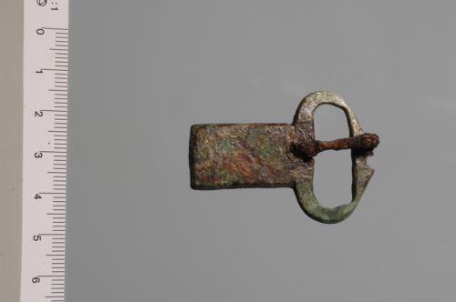 Fibbia a placca fissa rettangolare con anello ovale espanso in corrispondenza della battuta dellardiglione, per la quale presenta un incavo; sul lato opposto dellanello un foro permette larticolazione dellardiglione, rettilineo a sezione quadrata. La superficie anteriore è liscia, i margini obliqui; sul retro, piatto, si trovano due maglie forate per il fissaggio alla cintura.
