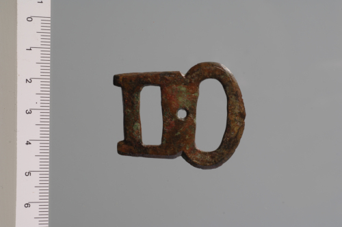 Fibbia a placca fissa con ampio foro rettangolare e traversa esterna più sottile - sorpassata alle estremità dalla prosecuzione dei lati brevi - per infilare e ripiegare la cintura; anello ovale lievemente espanso in corrispondenza della battuta dellardiglione, per la quale vi è un incavo appena accennato; tra lanello e la placca si trova un foro circolare per larticolazione dellardiglione. Margini anteriori obliqui, retro piatto.
