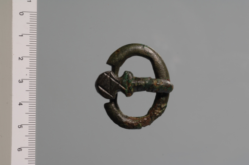 Fibbia con anello ovale a sezione lenticolare e netto restringimento in corrispondenza della traversa, rettilinea e a sezione circolare, posizionata lungo il profilo interno dellanello; ad essa è agganciato lardiglione, a superficie superiore bombata e punta ricurva, che presenta la base a scudetto piuttosto allungato, con marcate rientranze laterali ed entrambe le terminazioni curvilinee, decorato da incisioni rettilinee parallele e diagonali incrociate.