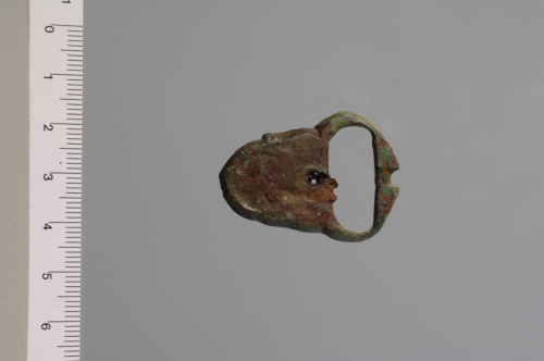 Fibbia a placca fissa a forma di scudetto sagomato ai lati, con margini obliqui; sulla superficie sono presenti labili tracce - verosimilmente prodotte da una matrice assai consunta - di un decoro a U che asseconda il profilo della placca e termina con estremità ritorte, allinterno del quale vi sono elementi di riempimento. Anello ovale con espansione in corrispondenza della battuta dellardiglione, per la quale vi è un incavo; sul lato opposto dellanello, un foro circolare permette larticolazione dellardiglione. Sul retro, a superficie lievemente concava, si trovano due maglie forate al centro, per il fissaggio alla cintura.