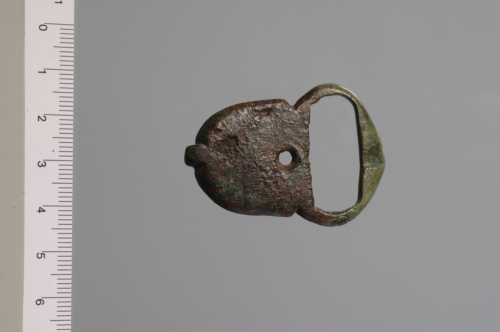 Fibbia a placca fissa a "U" apicato al vertice, con superficie liscia e margini arrotondati; anello ovale con espansione in corrispondenza della battuta dellardiglione, per la quale vi è un lieve incavo; sul lato opposto dellanello, un foro circolare doveva permettere larticolazione dellardiglione. Sul retro, a superficie lievemente concava, si trovano due maglie forate per il fissaggio alla cintura.