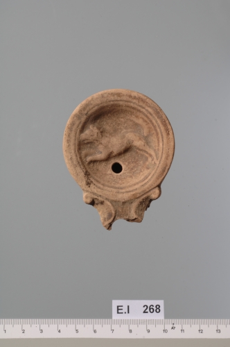 L'esemplare, privo di parte del becco, presenta un serbatoio a forma di tronco di cono rovesciato e una spalla decorata da due circonferenze incise e due cordoli di dimensioni diverse (IVa). Il disco concavo è decorato da un cane in corsa verso sinistra. L'animale, dalle forme pesanti è reso in modo sommario e con particolari ottenuti con un rapido ritocco. Due solchi sul collo fanno pensare ad un cane con collare. Sotto l'animale, leggermente decentrato a sinistra, è praticato l'infundibulum. La base piatta è delimitata da una circonferenza incisa.Corpo ceramico depurato arancio chiaro con tracce di vernice rosso-bruno scura.