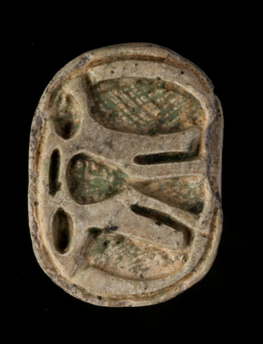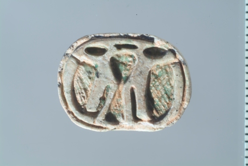 Sulla faccia superiore convessa dello scarabeo sono indicate in rilievo e incisione la testa, il protorace, le elitre e le zampe. Sulla faccia inferiore piana sono incisi dei motivi geometrici (?).