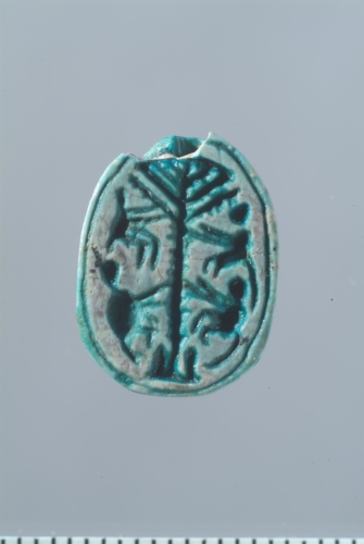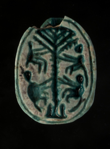 Scarabeo:sulla faccia superiore sono indicati in rilievo e incisione la testa, il protorace, le elitre e le zampe; sulla faccia inferiore piana sono incise quattro scimmie disposte simmetricamente ai lati di una palma che costituisce l'asse verticale della composizione; i rami seguono il margine curvo superiore ddell'oggetto.