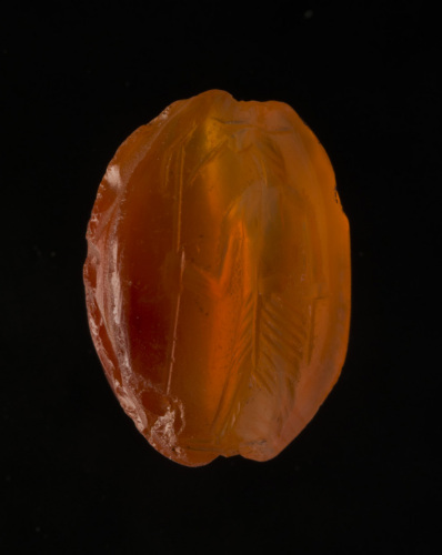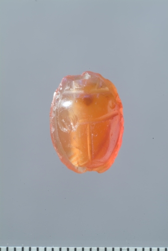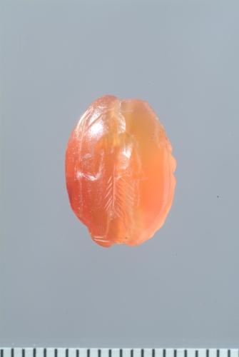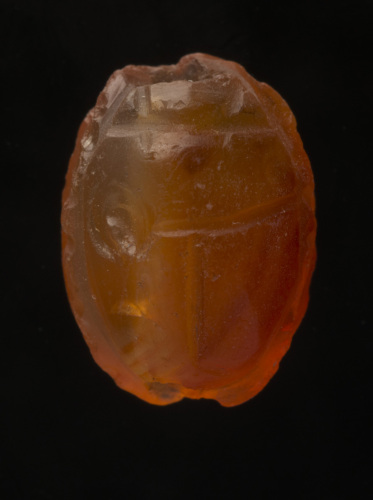 Sulla faccia superiore dello scarabeo sono indicati in rilievo e incisione la testa, il protorace, le elitre e le zampe. Sulla faccia inferiore piana è incisa la figura di THOT con testa di ibis, stante di tre-quarti verso sinistra, con la testa di profilo, caratterizzata dal lungo becco. Il dio impugna il lungo scettro puntato a terra, col braccio destro piegato.