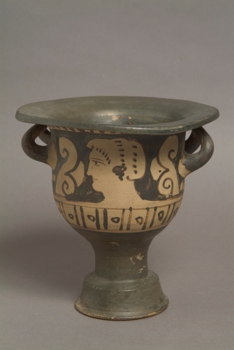 Labbro estroflesso, corpo non molto allungato, rastremato in basso, alto piede modanato, anse a bastoncello cilindrico ripiegate all'insù. Descrizione in A: profilo femminile con sakkos ricamato tra girali e campanule il cui disegno è ridotto ai tratti essenziali; in B fiore campanulato tra girali e campanule stilizzati. Decorazione accessoria: sotto l'orlo trattini verticali; sotto le anse palmette; sotto la zona figurata decorazione metopale costituita da una sequenza orizzontale di elementi di astragalo approssimati e semplificati.