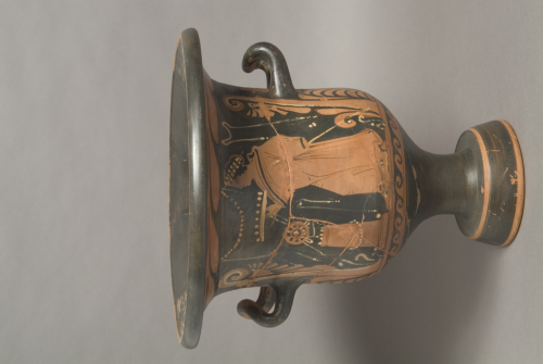 - NOTIZIE STORICO CRITICHE Attribuito al Pittore di Napoli 2585 per la presenza di alcuni motivi-firma: palmette triangolari ornate al centro da un punto e il bordo del mantello liscio e non dentato, secondo la consuetudine della ceramica pestana.