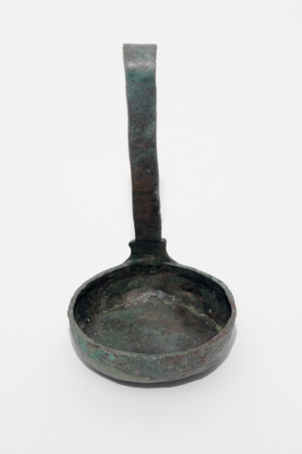 vasca a calotta con orlo limato in modo irregolare, pareti diritte, fondo piano; manico a nastro in due pezzi uniti per fusione, collegato alla vasca con una doppia saldatura tramite una placca trapezoidale; terminazione superiore ripiegata e sinuosa, a forma di protome di palmipede stilizzato. Sul lato esterno del manico si riconosce un tratto a X (t) debolmente inciso.