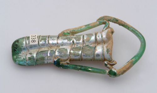 orlo ripiegato all'interno, su cui sono saldate due anse a bastoncello ripiegate e impostate circa a metà del corpo; le due anse sono congiunte da un'ansa a cestino. Due corpi tubolari non comunicanti, uniti a caldo, senza distinzione tra ventre e collo, sui quali è avvolto un filamento a spirale, applicato a caldo