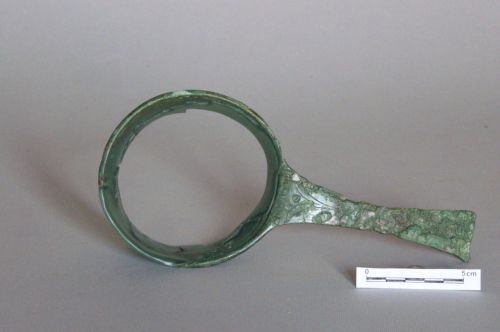 parete cilindrica e orlo leggermente ingrossato; manico leggermente sagomato decorato sulla faccia superiore, all'attacco con la vasca, da un kyma sotto cui sono una fascia a graticcio, un doppio cerchiello e una doppia V campita internamente con sottili linee parallele