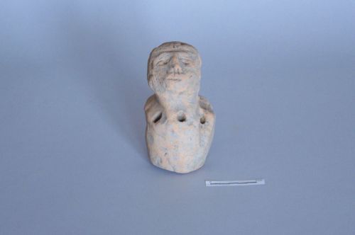 peso cilindrico con sommità configurata a testa maschile volta verso l'alto; alla base del collo è presente una serie irregolare di fori