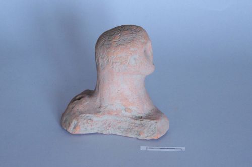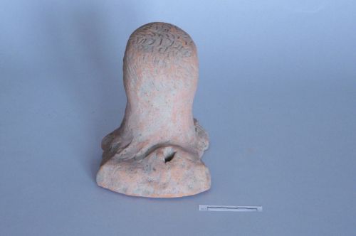 testa maschile con corta barba, capigliatura divisa in core ciocche aderenti al capo e volto caratterizzato da occhi e bocca infossati