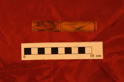 Cilindro di legno decorato ad incisione presso le estremità e la parte mediana, sagomata con due anelli sottili in rilievo.La superficie lignea si presenta in ottimo stato di conservazione.
