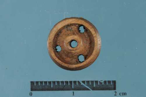 Bottone piccolo tornito di forma circolare con 4 fori passanti.