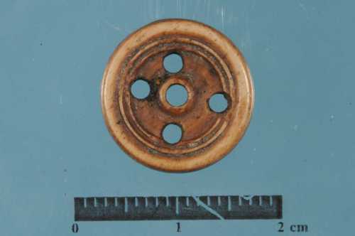 Bottone tornito con 5 fori passanti e con bordo leggermente rilevato e decorato con due cerchi concentrici. Il foro centrale presenta un bordo in rilievo. Mentre una delle due facce è liscia, l'altra è lasciata allo stato grezzo.