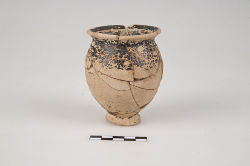 Bicchiere con corpo ovoide, orlo arrotondato, breve labbro rettilineo, svasato, piccolo piede ad echino con fondo esterno concavo. L'argilla è di colore beige, la vernice è nero-bruna, opaca, diluita.