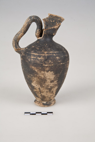 Oinochoe a becco schiacciato con pareti avvicinate, corpo ovoide con spalla obliqua espansa, breve collo concavo, piede ad anello distinto con piccolo umbone di tornitura sul fondo esterno, ansa a bastoncello a profilo sinuoso, impostata verticalmente sulla spalla e sul collo. L'argilla è di colore beige, vernice nero-bruna, opaca, diluita. Tracce di impronte digitali sul collo del piede.