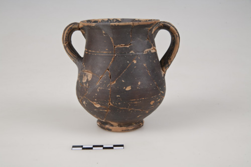 Kantharos/bicchiere con corpo ovoide, a ventre ribassato, orlo assottigliato, estroflesso, collo concavo sottolineato alla base da scanalatura orizzontale, anse a nastro con due costolature mediane impostate subito sotto lorlo e sulla spalla, piede ad anello a profilo leggermente curvo, distinto dal corpo da scanalatura orizzontale, fondo esterno del piede, piatto con lieve umbone di tornitura, allinterno, sul fondo, marcate scanalature concentriche di tornitura. Tracce di impronte digitali in prossimità del piede. L'argilla è di colore arancio, la vernice è nero-bruna, opaca, diluita.