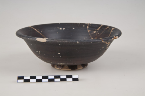 Coppa con ampia vasca profonda a profilo sinuoso, con parte superiore a pareti rettilinee, svasate, e parte inferiore bombata, spesso orlo arrotondato, estroflesso, piede ad anello con profilo troncoconico e spigolo arrotondato, fondo esterno piatto con leggero umbone di tornitura. Allinterno della vasca disco dimpilamento decentrato, a risparmio; sulla superficie esterna della vasca cerchi concentrici di tornitura. Tracce di impronte digitali in prossimità del piede e sul collo. L'argilla è di colore beige arancio, la vernice è nero-bruna, opaca, diluita.