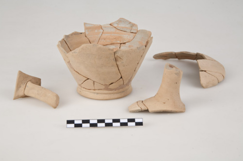 Frammento di collo cilindrico con parte della spalla, parte della spalla con lieve carena a spigolo arrotondato, piede ad anello obliquo distinto dal corpo da una costolatura orizzontale, fondo esterno convesso e lieve umbone di tornitura, parte di ansa verticale a nastro con due costolature verticali. L'argilla è di colore beige arancio.