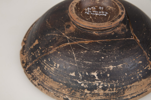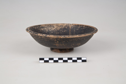 Coppa con orlo appiattito, assottigliato, leggermente espanso allesterno, vasca larga e profonda con parte superiore a pareti svasate, parte inferiore con carena arrotondata, piede ad anello troncoconico a profilo angoloso, fondo esterno con lieve umbone di tornitura. Allinterno della vasca, al centro, lieve umbone di tornitura e disco di impilamento rosso bruno. Tracce di impronte digitali, in prossimità del piede e sul piede. Sulla parete esterna, sulla parte carenata, cerchi concentrici incisi, sempre sulla parete esterna, marcati segni di tornitura. Segno graffito dopo la cottura, specie di asterisco con tratti irregolari (segno casuale ?), sul fondo esterno del piede altri segni graffiti irregolari e casuali (?). Largilla è di colore beige-arancio, la vernice è nero-bruna, opaca, con chiazze rosso brune sulla parete esterna, fondo esterno del piede con vernice marrone.