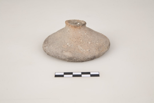 Coperchio di anfora con orlo esterno ingrossato, a sezione sub triangolare, calotta troncoconica, presa a disco piatto, irregolare. L'impasto è di colore grigiastro con chiazze rosate, grossi inclusi calcarei e ferrosi.