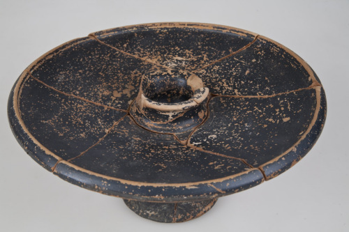 Piatto da pesce con orlo estremamente ingrossato, a sezione sub triangolare, obliquo verso lesterno, vasca con pareti concave, al centro della quale vi è una piccola ciotola cilindrica con pareti a profilo concavo svasate verso lalto e con orlo esoverso, alto piede cilindrico, pieno, leggermente modanato a profilo obliquo, cavo allinterno, ma con ampio piano di appoggio piatto. Allinterno della vasca cerchio inciso verso il centro. L'argilla è di colore arancio, polverosa, la vernice è nera, opaca.
