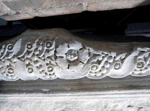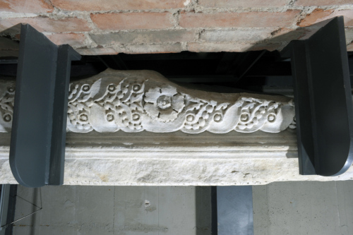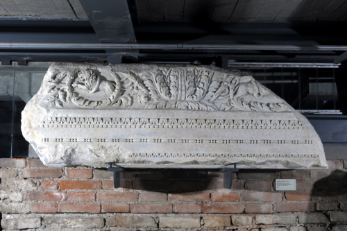 Il blocco di marmo è caratterizzato, a partire dall'alto, da un fregio decorato con un cespo d'acanto centrale da cui si dipartono due girali con ciascuno un leone rampante al centro, rivolto verso l'esterno. Il fregio è incorniciato inferiormente da un listello liscio, da un kymation lesbio continuo con elemento a forbice aperta fino alla base, una fila di perline, un listello liscio, un'altra fila di perline di maggiori dimensioni rispetto alle precedenti, e da un listello liscio. L'architrave è decorato anche nella faccia inferiore, con un motivo a treccia a due nastri, di cui uno liscio e l'altro lavorato a perline, che si snodano in modo alterno intorno a bottoni rilevati; al centro della composizione spicca un fiore centrale a cinque petali frastagliati, con bulbo dalla corolla rigonfia e bottone rilevato. Il blocco presenta nella parte posteriore un incavo circolare.